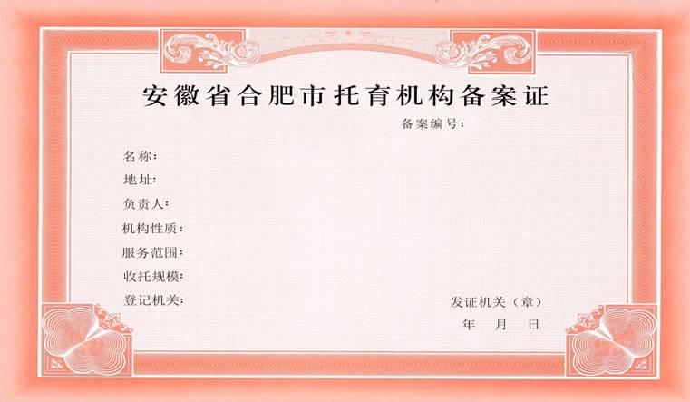 为规范我市婴幼儿托育机构管理,促进托育服务事业健康发展,方便社会查询、监督托育机构备案情况,合肥市卫健委于近期统一印制了《安徽省合肥市托育机构备案证》。自2021年9月27日起,全市已备案和准备备案的托育机构,均可前往主管部门(辖区卫生健康部门)领取备案证。