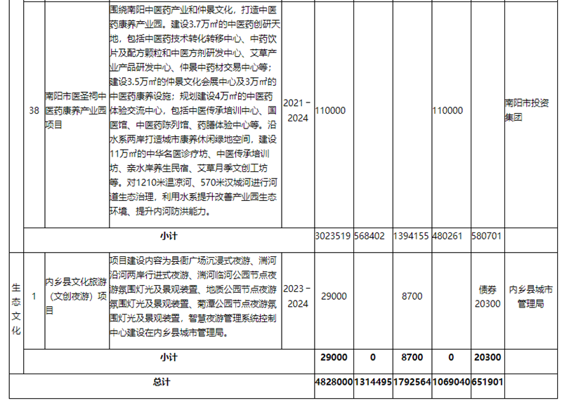(6)生态文化体系建设,实施内乡县文化旅游(文创夜游)项目,投资额2.9亿元。