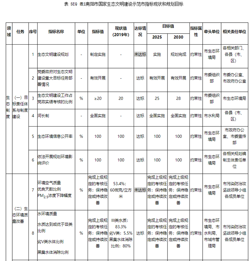 南阳市生态文明建设指标体系及2025年、2030年目标见下表:
