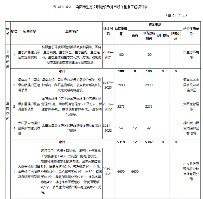 (1)生态制度体系建设,实施南阳市国家生态文明建设示范市规划编制项目,投资额100万元。