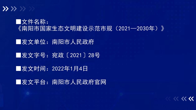 生态文明制度建设稳步推进。成立了高规格的南阳市生态文明建设指挥部,形成了市委常委挂帅、市级领导全员参加、各部门全面参与、齐抓共管的生态文明建设格局。近年来,南阳市还制定了一系列的规章制度,如《南阳市白河水系水环境保护条例》《南阳市生态文明建设促进条例》等,对市域生态文明制度建设进行了积极探索,初步形成了自上而下完备的考核和管理体系。《南阳市生态文明建设促进条例》于2021年1月1日起施行,是河南省首部生态文明建设地方性法规,将为持续推动南阳市生态文明建设各项事业蓬勃发展提供强有力的法治保障。